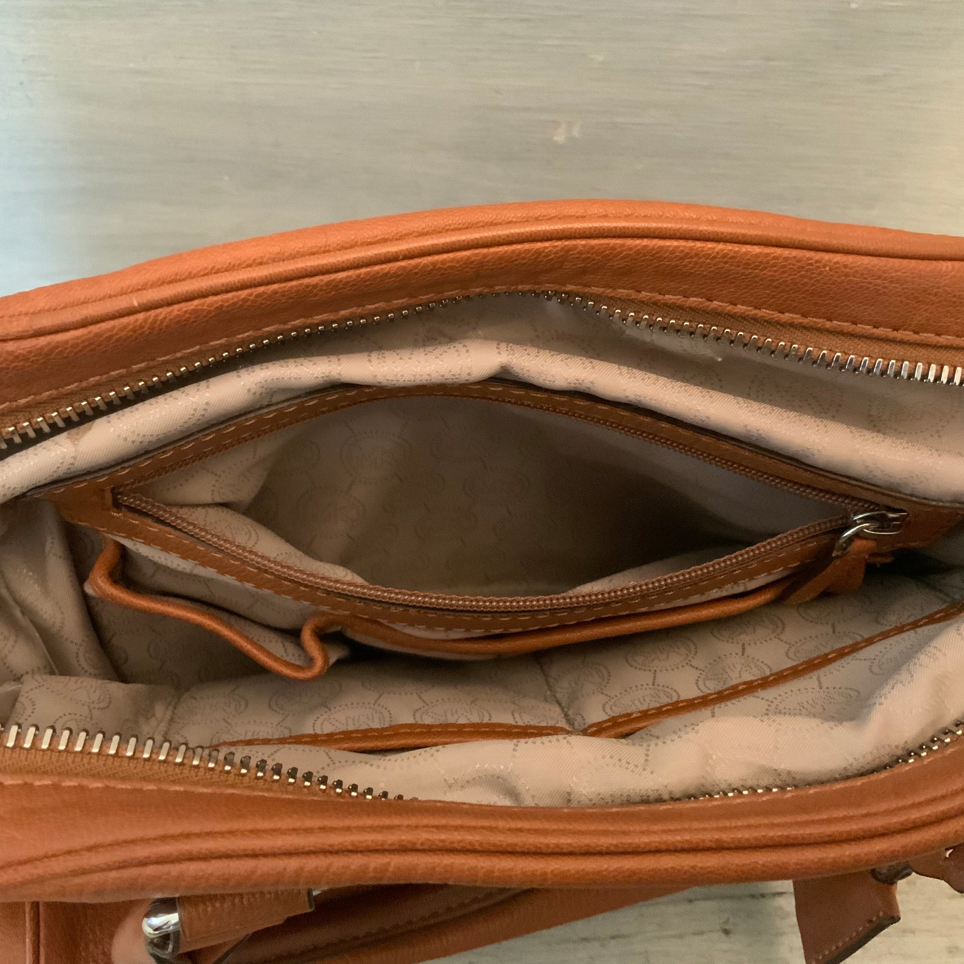 Silver hardware, zip closure, external zip pocket, internal zip pockets, open internal pockets, built in keychain, footed