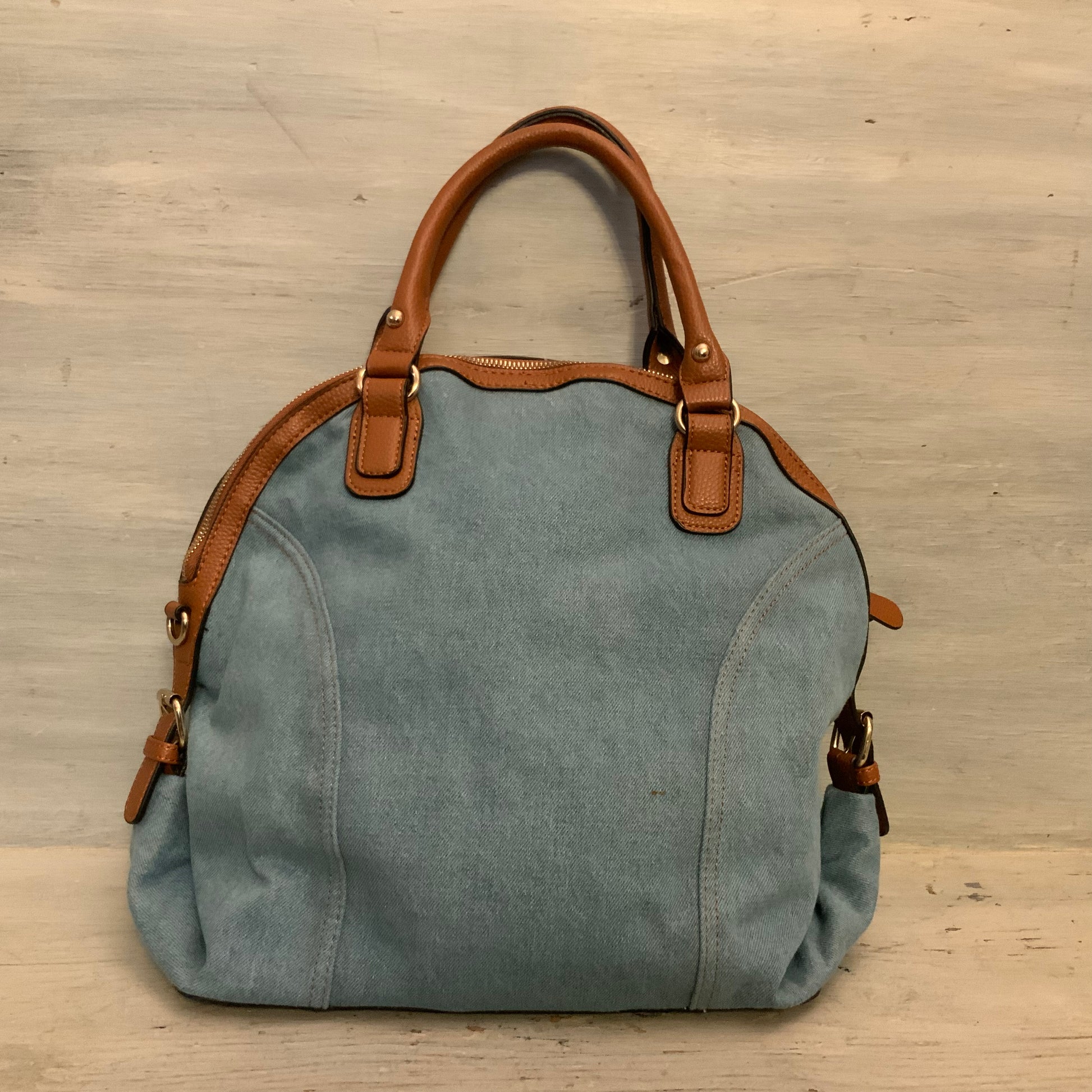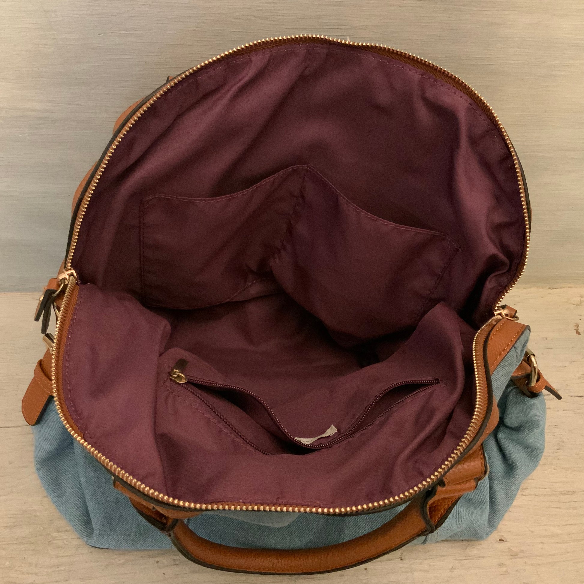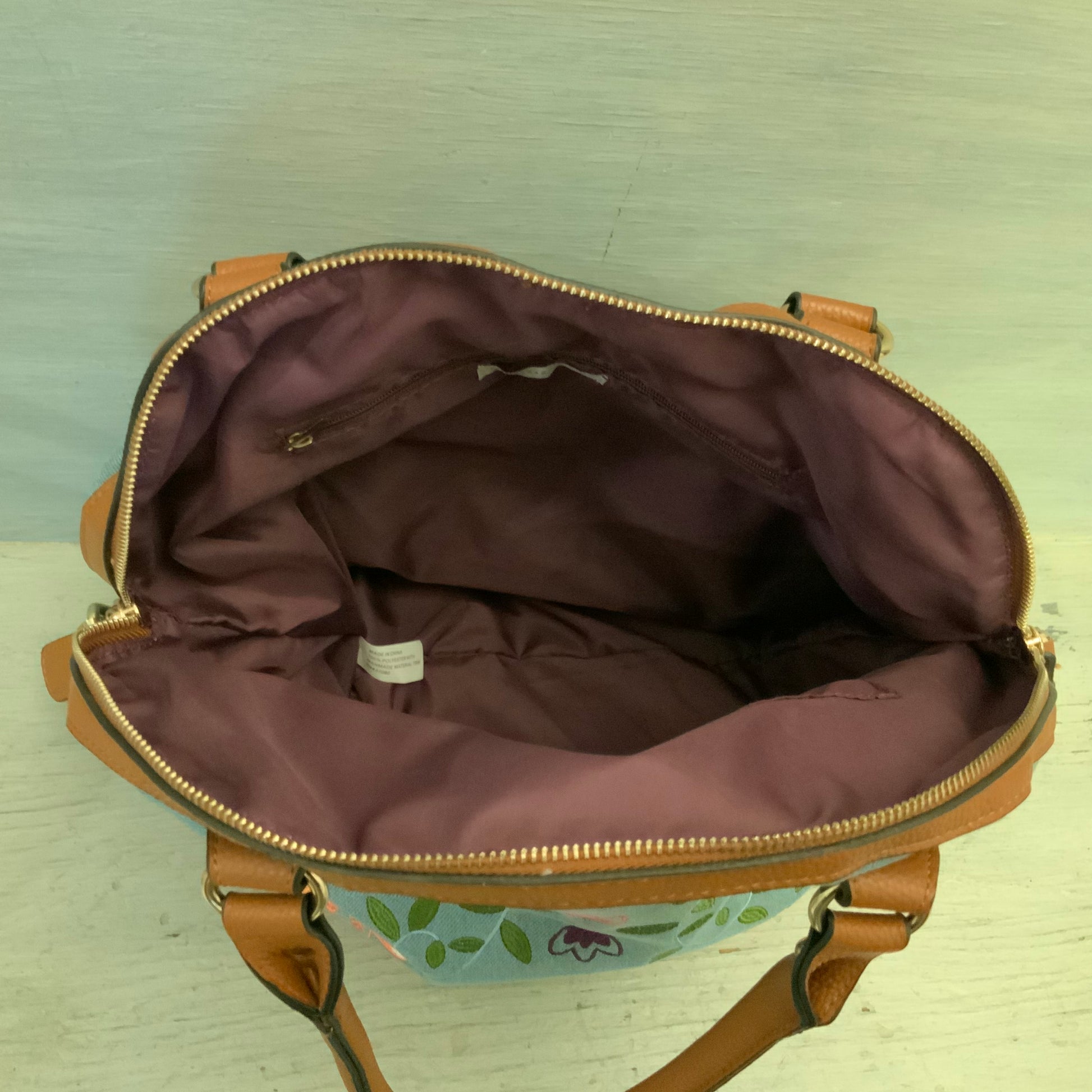 Cato Embroidered Flower Print Denim Brown Faux Leather Handbag Purse Like New